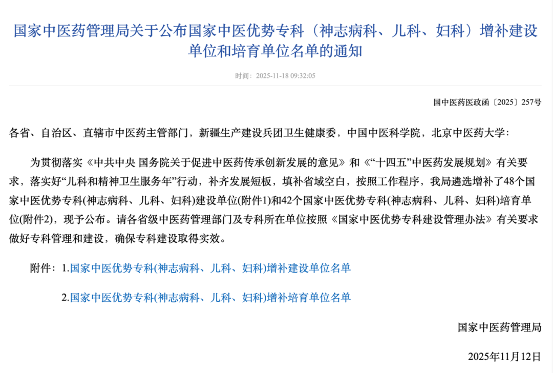 为贯彻落实《中共中央国务院关于促进中医药传承创新发展的意见》和《“十四五”中医药发展规划》有关要求,落实好“儿科和精神卫生服务年”行动,补齐发展短板,填补省域空白,国家中医药管理局遴选增补了48个国家中医优势专科(神志病科、儿科、妇科)建设单位和42个国家中医优势专科(神志病科、儿科、妇科)培育单位,并于近日公布。首都医科大学附属北京中医医院心身医学科获批国家中医优势专科建设单位、儿科获批国家中医优势专科培育单位。北京中医医院国家中医优势专科总数达到13个。