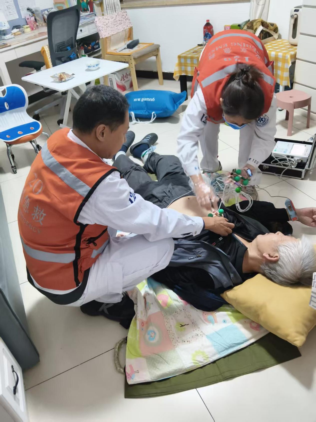 抵达现场时,老年男性患者平卧于地板,意识模糊。苏娜护士默契上前,迅速完成心电图、血压、血糖等基础检查,动作精准利落;左英医生俯身查体,不放过任何细节,结合患者既往房颤病史,以及急性起病、口角歪斜、肢体偏瘫、言语不清的典型症状,完全符合脑卒中“FAST”判断标准,“急性缺血性脑卒中”的诊断瞬间确立。