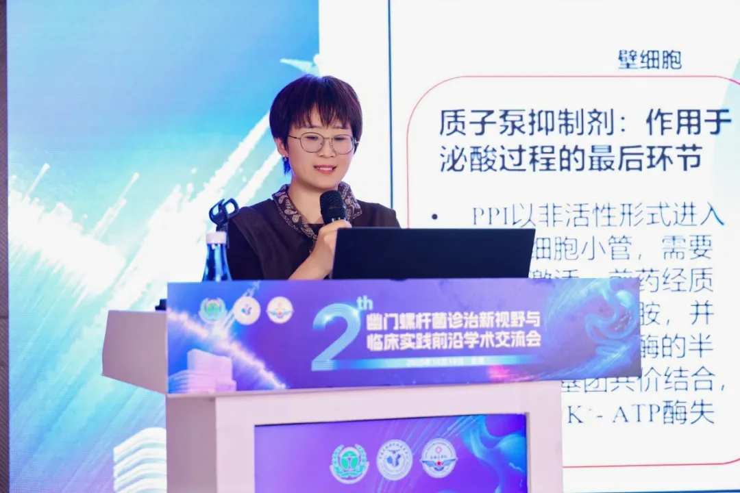 我院消化内科副主任医师赵晓琳、主治医师范婵娟分别从不同治疗维度作专题分享,进一步丰富了Hp治疗的临床工具箱。赵晓琳以抑酸药物的进展为题,详细介绍了质子泵抑制剂(PPI)的优化应用、新型抑酸药物(如凯普拉生)的作用机制与临床疗效数据,结合相关临床研究,强调了强效抑酸在提升Hp根除率中的关键作用。