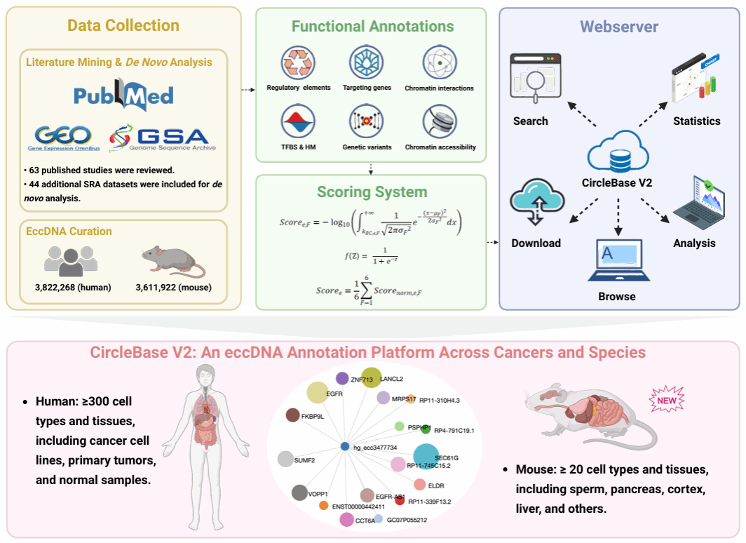 eccDNA在基因转录调控、染色质结构重塑及肿瘤异质性等生物学过程中具有重要作用。然而,现有eccDNA数据分散在不同数据库和文献中,缺乏系统整合。研究者在获取不同组织、疾病类型和物种的eccDNA数据时面临困难,同时也缺少统一的功能注释和优先级评估工具,使得识别功能相关的eccDNA、分析其调控网络以及设计实验验证方案具有挑战性。