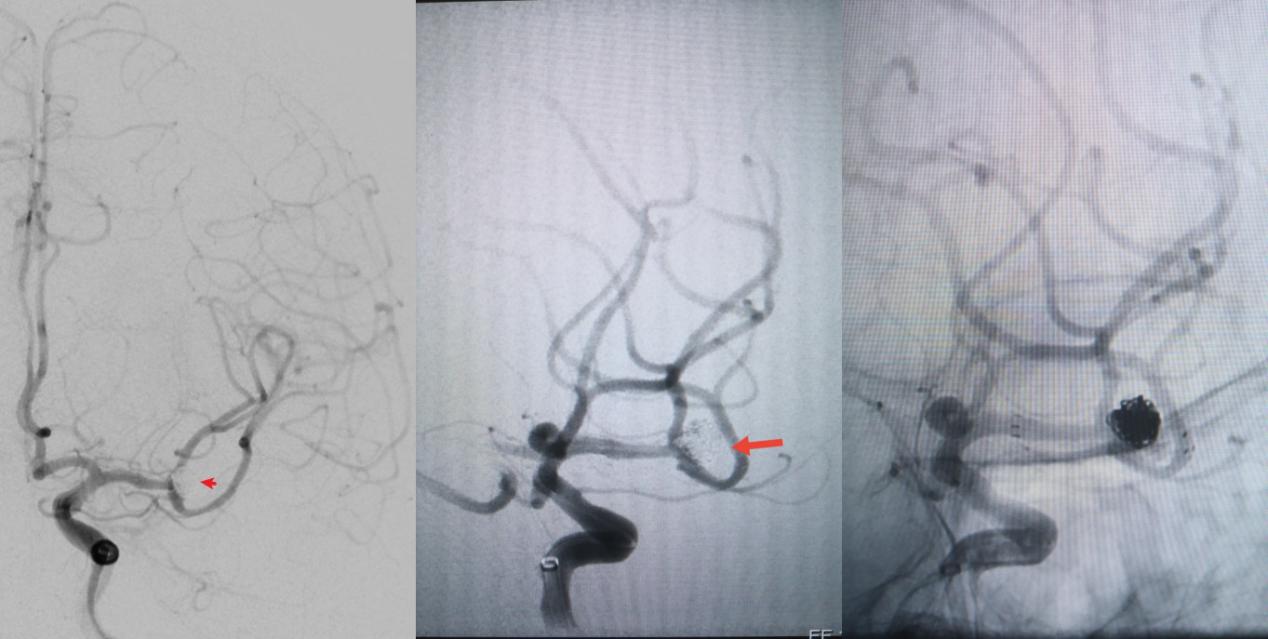病例二为58岁女性患者。因“突发剧烈头痛伴呕吐3小时”就诊于清华大学附属垂杨柳医院急诊科,行头颅CT检查提示蛛网膜下腔出血。患者嗜睡,频繁呕吐,不排除颅内再出血。为争分夺秒抢救患者生命,神经外科脑血管病介入团队紧急为患者实施了DSA,显示左侧大脑中动脉分叉处宽颈动脉瘤,主要累及下干。术中采取双微导管技术,于动脉瘤内填塞弹簧圈,并置入一枚支架保证致密栓塞和下干分支血管的通畅。成功“拆弹”,化险为夷,患者恢复过程顺利,出院时无神经功能缺损。