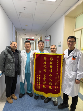术后即刻患者从昏迷中醒来,第二天四肢肌力恢复正常。通过康复锻炼,患者已能独立行走,生活自理,无明显后遗症发生。家属送来一面锦旗:“影领精准、介入非凡、毫厘之间、生命护航”。这十六个大字,承载着一个家庭的完整,也映照着作为医者的初心。