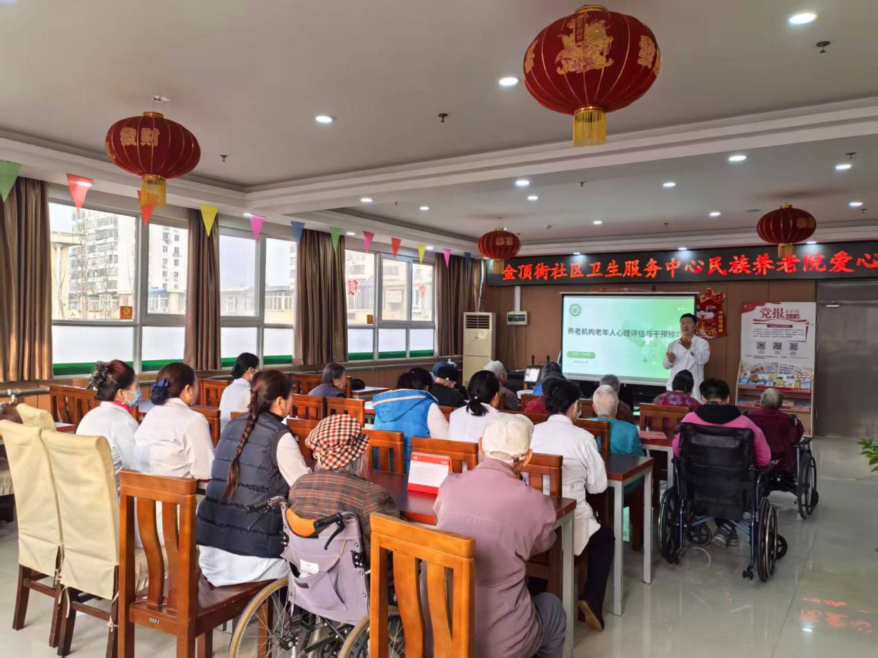 活动中,中心医务社工王治国以《养老机构老年人心理健康评估与干预技巧》为题,为老人和护理员带来专题分享。他从老年人心理健康的影响因素入手,系统讲解如何科学评估老年人的心理状态,并针对失能卧床老人与具备自主活动能力老人的不同特点,介绍相应的心理干预策略。此外,他还就如何提升养老照护人员的心理支持能力提出了实用建议,助力护理团队实现从“照护”到“赋能”的转变。