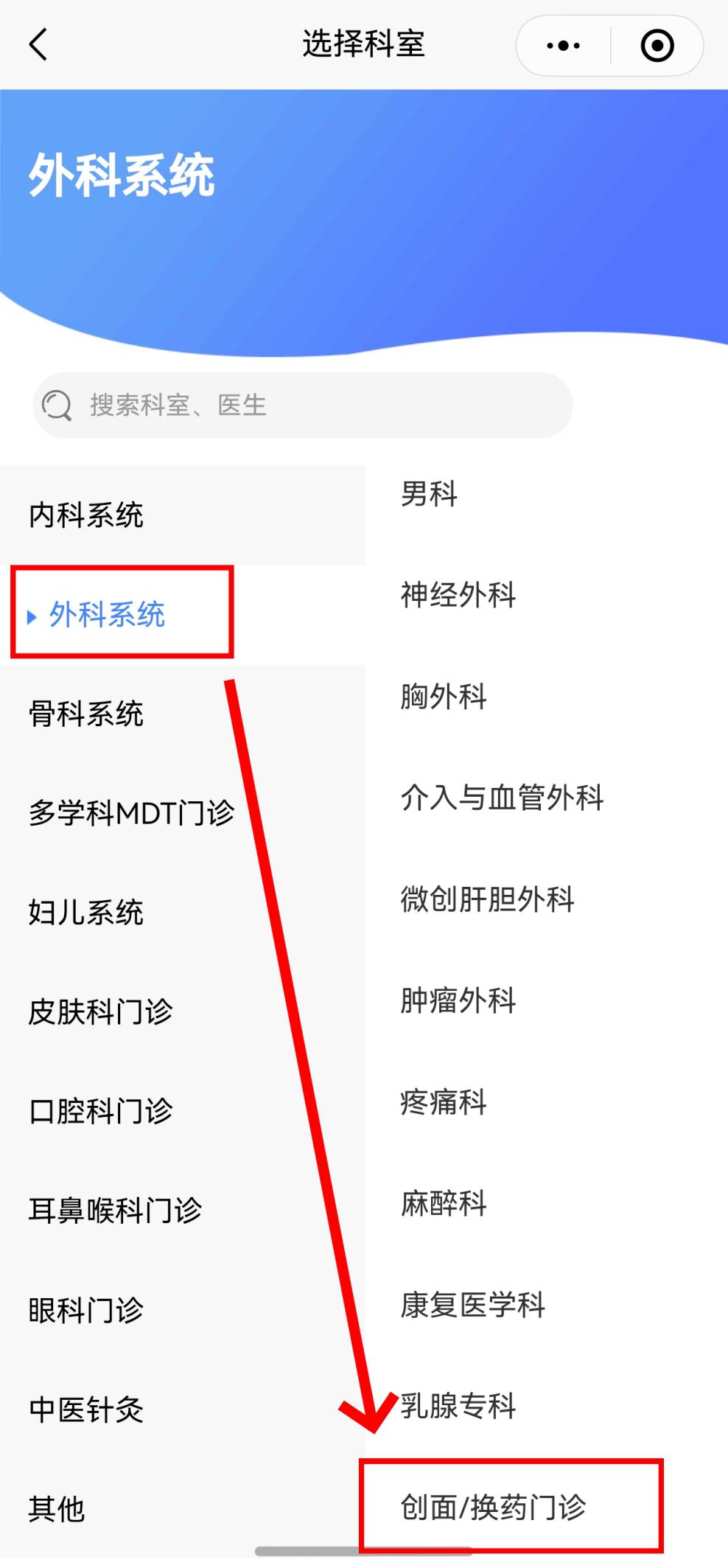 ●小程序预约挂号选择流程:预约挂号--外科系统--创面/换药门诊。