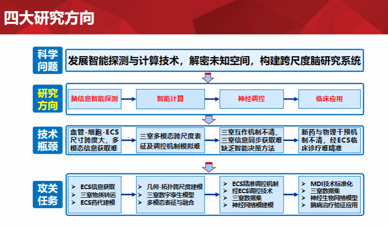 实验室聚焦于脑病治疗国际难题,重点对脑内纳米尺度细胞外间隙(ECS)超微结构成像与数学特征智能计算展开攻关,突破传统“细胞-血管”两腔室研究范式,研究“细胞-ECS-血管”三腔室几何拓扑数字建模与解耦成像技术,建立多物理场耦合的分子扩散与三腔室互作模型,构建“分子-细胞-脑”跨尺度类脑仿真系统,发展基于ECS多模态图像数学表征的智能诊断、新药研发与脑病治疗新理论、新方法。以多学科交叉为特色,突破传统脑科学研究的学科壁垒,打造北京市脑科学技术转化的标杆基地。