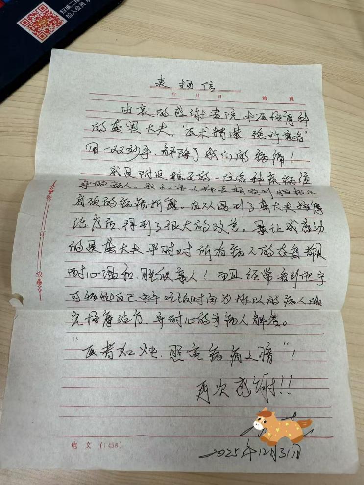 信中写道,每次治疗,龚奥手法精准到位,长期坚持下来,改善远超预期。更让患者和居民们感动的是龚奥的敬业与忘我。午休时分,常见别人已去用餐,龚奥的治疗室门口却还有排队等候的患者,“他常常牺牲自己的休息时间,耐心地为每一位患者做完治疗,细致解答他们的疑问,仿佛忘记了疲惫。”医者如炬,照亮病情之苦,感谢信中的这句话,正是居民对他最直观的感受。大家看在眼里,记在心上,这一点一滴的付出,汇聚成了深厚的信任与感激。
