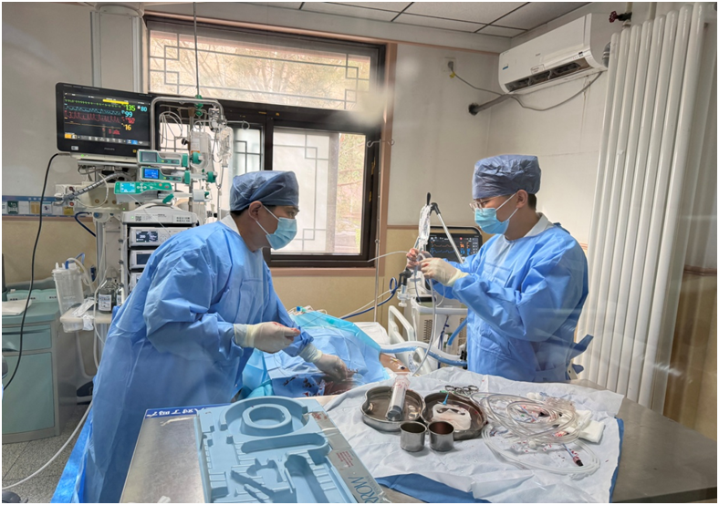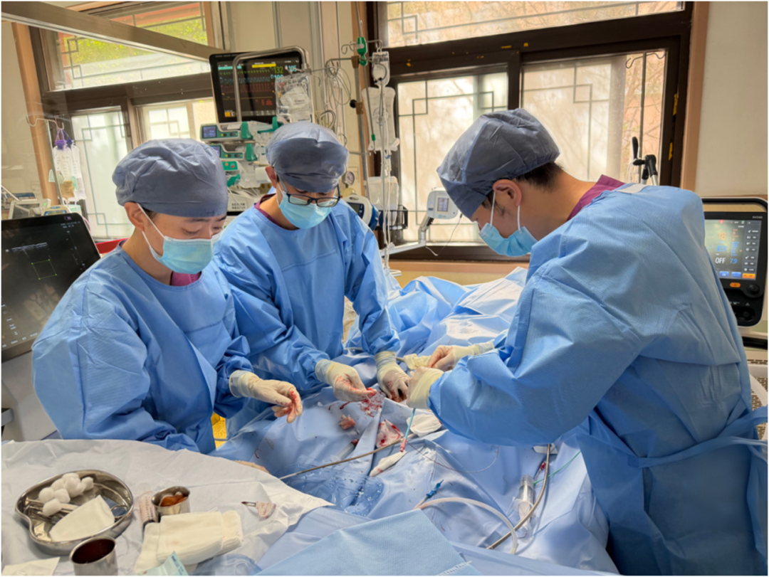 ICU评估心脏功能发现,吴先生心源性休克已进入难治性阶段:左心室射血分数仅20%,乳酸高达13mmol/L,心率、血压极不平稳,大剂量的升压药物联合应用难以维持有效循环,心源性休克持续进展。同时,因肾脏灌注不足,患者每小时尿量不足10ml,血肌酐升至167.9μmol/L,所有器官损伤均继发于心源性休克这一根本矛盾。重症医学科医疗团队启动ECMO穿刺置管,与此同时心血管科主任医师尚菊菊、李爱勇、主治医师张振民开始启动IABP,急诊危重症诊疗中心负责人郭伟全程指挥抢救。
