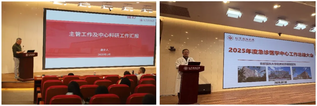 2026年1月10日(周六)上午,常营院区科研教学楼报告厅内气氛热烈,北京朝阳医院急诊医学中心全体医护人员(在岗人员除外)齐聚一堂,认真听取三院区六位分管主任与四位护士长的年度工作汇报。与会人员为急诊医学中心一年来取得的成绩感到无比自豪,也对发展中存在的不足展开深刻反思。2025年,急诊医学中心实现战略意义上的稳步发展,各项工作推进与医院七年发展规划高度契合、同频共振。
