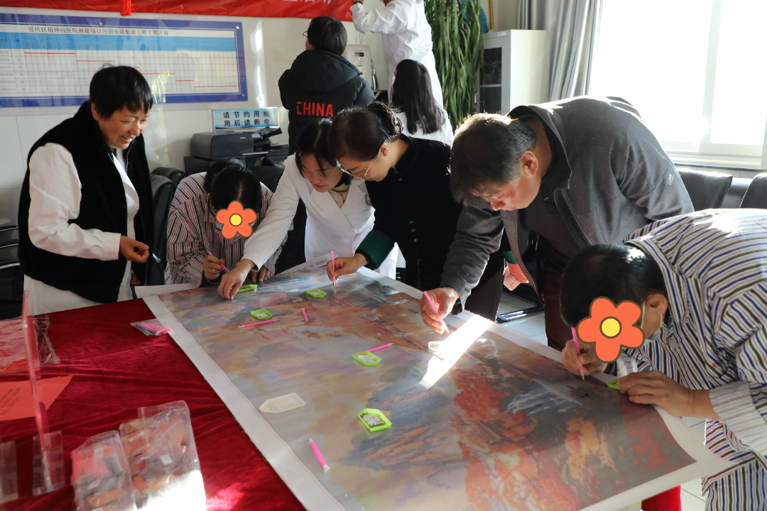 一幅主题为“旭日东升”的大型钻石绣铺展开来,大家分工协作、默契配合,小小的钻石在指尖流转,逐渐拼凑出朝阳初升的蓬勃景象,象征着多方携手助力精神康复的坚定信念。患者在专注创作中培养耐心,在团队协作中感受归属感。