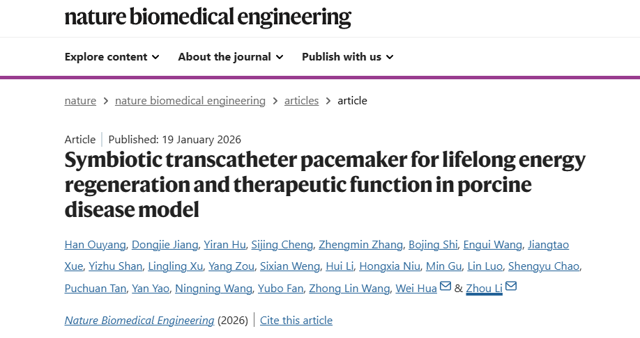 该研究以Symbiotic transcatheter pacemaker for lifelong energy regeneration and therapeutic function in porcine disease model(《共生型经导管起搏器在疾病模型中实现终身能量再生与治疗功能》)为题,发表在Nature Biomedical Engineering(《自然生物医学工程》)上。李舟、中国医学科学院阜外医院教授华伟为本文通讯作者,中国科学院大学副教授欧阳涵、北京大学第三医院副研究员蒋东杰、中国医学科学院阜外医院博士胡奕然、程思静,杭州电子科技大学副教授张正民为论文第一作者。中国科学院北京纳米能源与系统研究所王中林院士对该工作给予了重要支持。该工作得到了国家自然科学基金、国家重点研发计划、中科院青年创新促进会、北京市自然科学基金、北京市科技新星计划、新曦颠覆性技术创新基金以及中央高校基本科研业务费专项资金的联合资助。