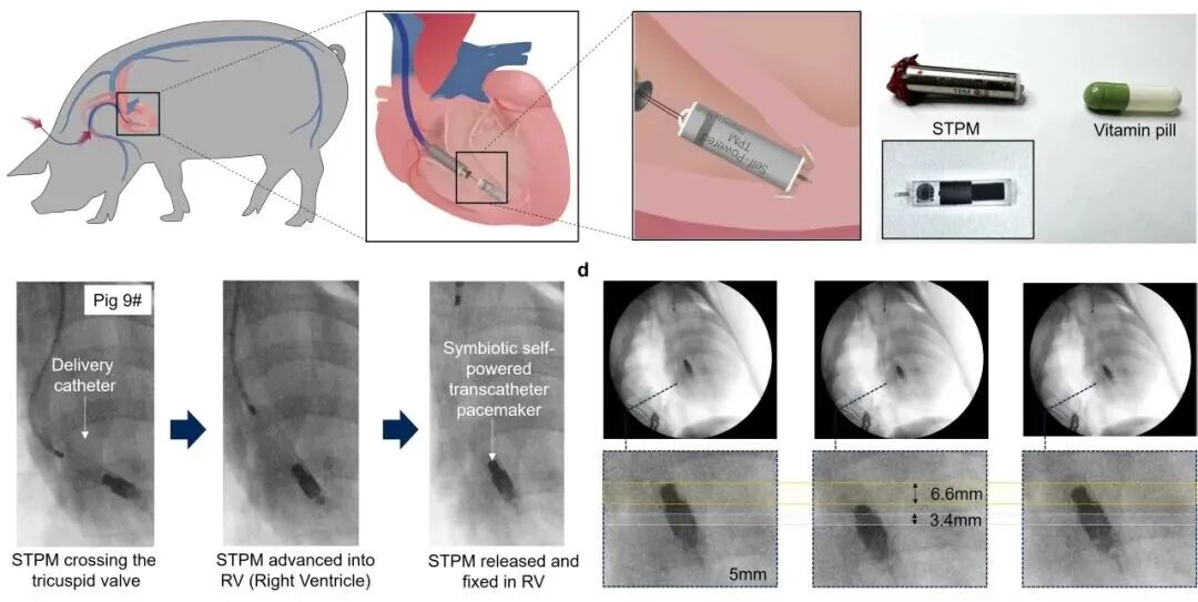 在猪三度房室传导阻滞心律失常模型中,该共生型起搏器完成了为期一个月的自主运行测试。实验期间,它持续实现能量自供给,同时稳定发挥起搏治疗功能,有效调控实验动物的心脏节律,充分验证了其临床转化可行性。