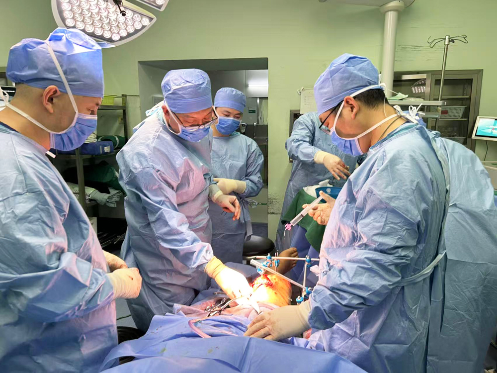 18时40分,手术正式开始。探查发现患者伤情极为复杂:股深动脉完全断裂,股静脉断裂,股骨远端呈粉碎性骨折,肌肉已出现缺血早期征象。在抢救的关键时刻,潞河医院院长、知名血管外科专家吴英锋刚结束一台复杂血管外科手术,听闻有危重血管损伤患者,便立即赶到了手术室。“建立血管通路,尽快恢复血流!”吴英锋迅速研判情况,主导血管吻合修复的关键环节。刘亮首先在5分钟内完成了跨膝关节外固定的临时固定。吴英锋亲自为患者精准吻合动脉,静脉毁损无法直接吻合,于是取同侧肢体大隐静脉移植吻合,当松开止血带和血管夹,看见动脉有了规律的搏动,血流重新灌注已苍白的下肢,足背动脉搏动从微弱到有力,肢体颜色逐渐红润,所有人都松了一口气。