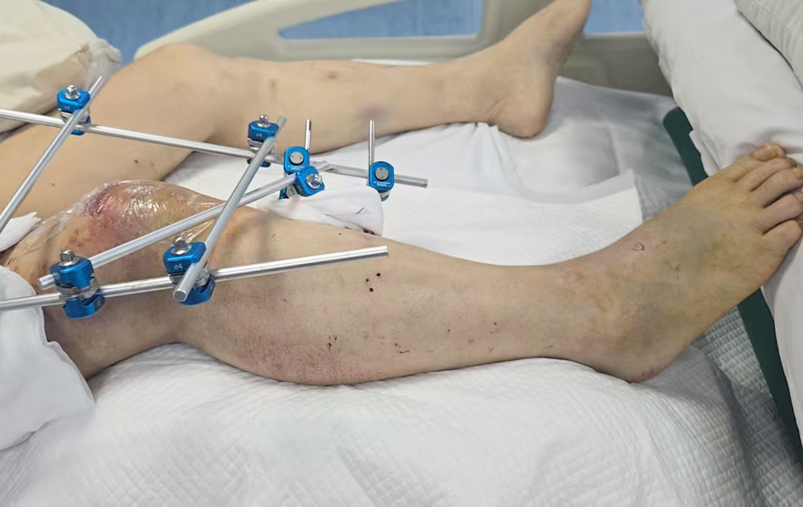 经过四个小时的多学科团队紧密协作,手术获得圆满成功。术后,患者转入重症监护病房,病情平稳后顺利转回创伤救治中心病房。后期经过骨中心创面修复团队的多次清创治疗,患者创面完全愈合,右腿成功保全,避免了截肢致残的悲剧,目前正在专业指导下进行积极的功能锻炼。