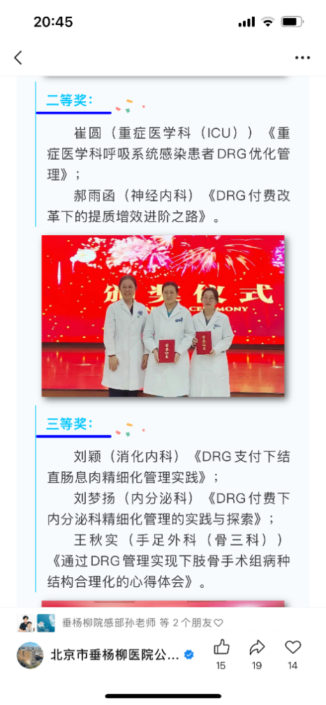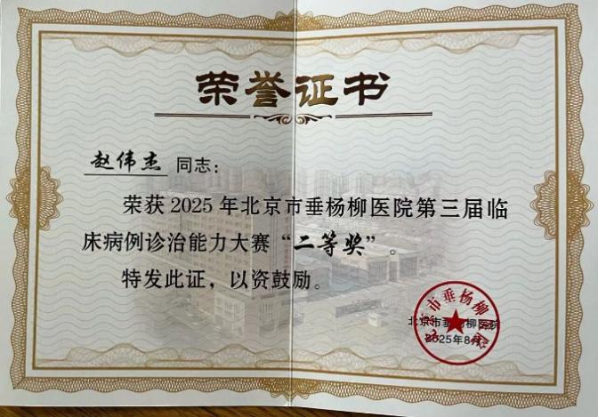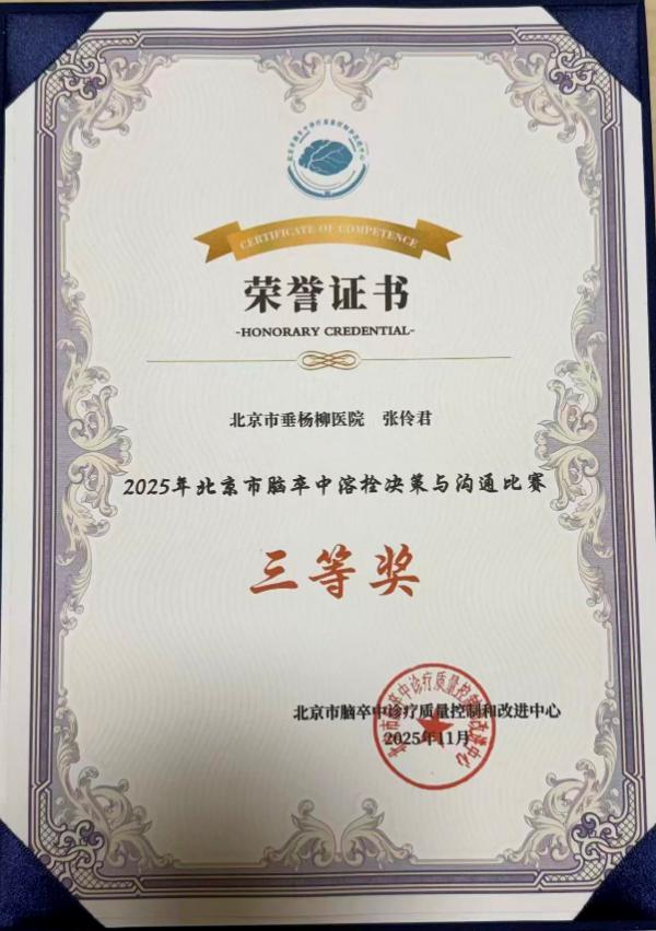 2025年科室在多项院外、院内竞赛中展现精湛技术与扎实功底,彰显团队卓越实力:在院外,在《中华神经科杂志》主办的2025第二届“更强大脑”全国病例演讲大赛区域赛中,神经内科主治医师刘志娟表现优异,荣获一等奖;在2025年北京市脑卒中溶栓决策与沟通比赛中,神经内科副主任医师张伶君荣获三等奖。在院内,在2025年首届病历书写技能竞赛、双人心肺复苏操作技能比赛、第三届临床病例诊治能力大赛以及DRG管理优秀案例大赛中,神经内科医师李欣育、神经内科医师郝雨函、9D病区护士张艺、神经内科主治医师赵伟杰等人斩获多项一等奖、二等奖。种种荣誉的取得,体现了科室全面的质量管理与临床能力。