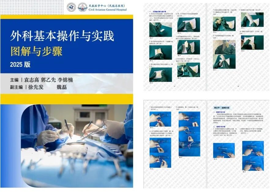 基于这一认识,并结合学生反馈,她提出并发起了《外科基本操作与实践 图解与步骤》的编写与组织,作为北京大学医学部民航总医院的内部教学参考资料,于2025年正式投入使用。教材由北京大学医学部民航总医院袁志高、郭乙先、李锦楠担任主编,徐先发、魏磊担任副主编,凝聚了一线教学经验与临床实践成果,形成了贴近教学实际、可操作性强的外科基础技能教学材料。