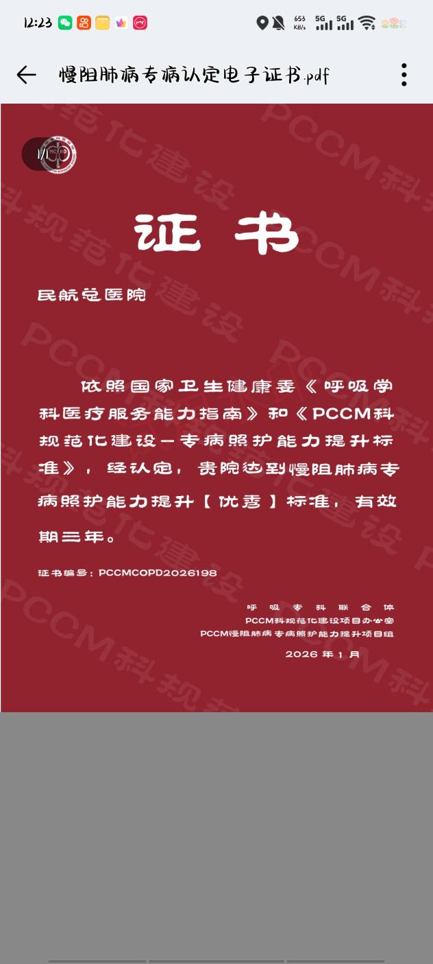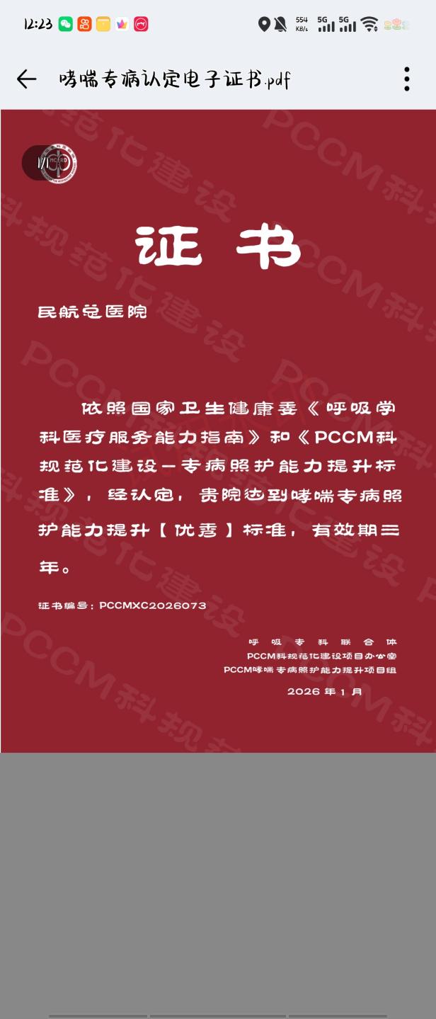 在随后开展的专病照护能力提升项目认定中,呼吸与危重症医学科在“哮喘”与“慢性阻塞性肺疾病(慢阻肺)”两大专病领域均获评“优秀”。“双认证”的通过,更体现了民航总医院呼吸学科在慢性呼吸系统疾病专病管理方面已达先进水平,学科整体实力实现跨越式提升。