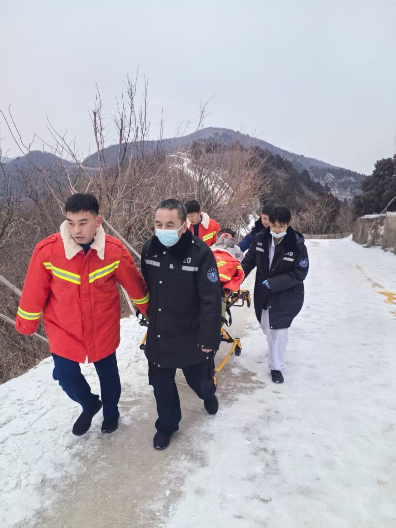 隆冬时节,石景山区虎头山上寒意彻骨,西南侧防火道被未融化的厚层冰雪覆盖,湿滑的路面与起伏较大的走势,构筑起一道“救援屏障”。近日,石景山区紧急医疗救援中心五里坨急救站接到紧急任务,一名登山爱好者在虎头山防火道区域不慎摔伤,急需专业救援力量驰援。
