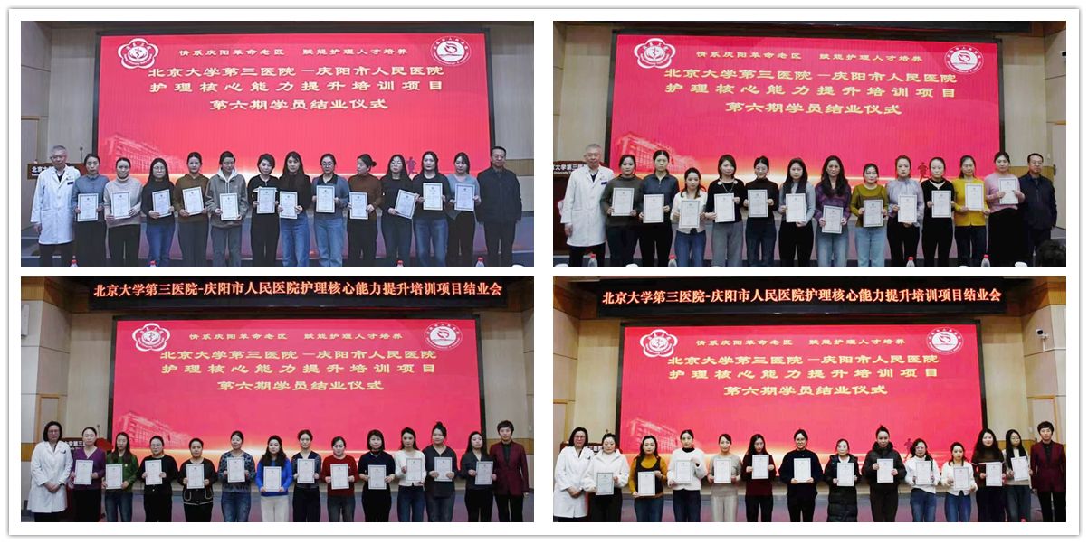 2026年2月6日,北京大学第三医院—甘肃庆阳市人民医院护理核心能力提升培训项目第六期结业仪式暨项目结项仪式在北京大学第三医院健康医学中心楼举行。庆阳市人民医院院长刘小伟、副院长唐秀琴,北京大学第三医院党委书记金昌晓、副院长李蓉,院长助理、护理部主任李葆华,以及庆阳市人民医院护理骨干等出席结业仪式。