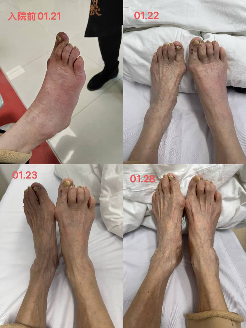 在服用中药期间,患者体温逐渐平稳,未再发热,至1月28日,右足红肿已完全消退,未诉疼痛,精神状态也焕然一新。