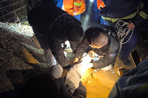 虎头山山路未知、夜色如墨,加之气温偏低,救援难度陡增。途中,急救团队第一时间与被困者取得联系,在确认其所处位置地形复杂、无开发路线后,当即判断单人救援难以完成,果断联动119消防、110公安力量开展协同救援。多方力量快速响应、高效集结,一支十余人的联合救援队伍迅速组建,手持救援灯、肩扛担架与救援绳索,毅然踏上荆棘丛生的虎头山险路。
