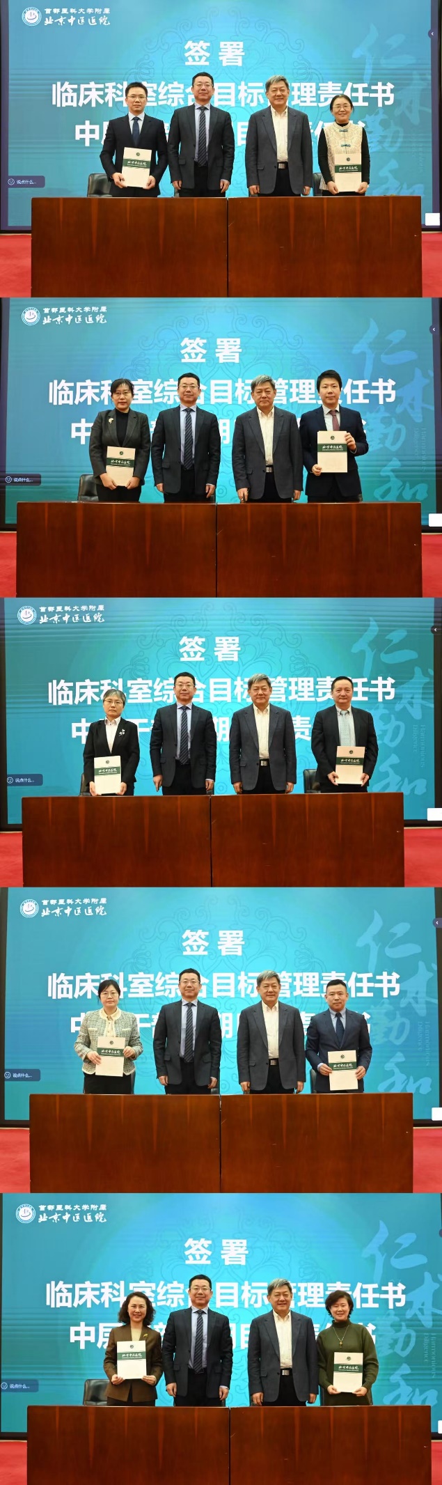 会议期间,党委书记刘中勋、院长刘清泉与医院临床科室、职能处室中层干部代表签署《临床科室综合目标管理责任书》《中层干部任期目标责任书》。心血管科、骨科、急诊科、心身医学科、放射科、药学部、党委办公室、门诊部、医学工程部、总务处10位中层干部上台签约。