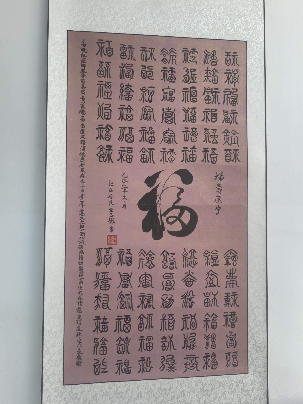 为表达谢意,这位酷爱书法的患者思来想去,决定用自己的方式——亲手书写一幅“百福图”,把最美好的祝福送给高医生。在她看来,一百个“福”字,既是对高医生医术的肯定,更是对这位基层医生默默付出的敬意。