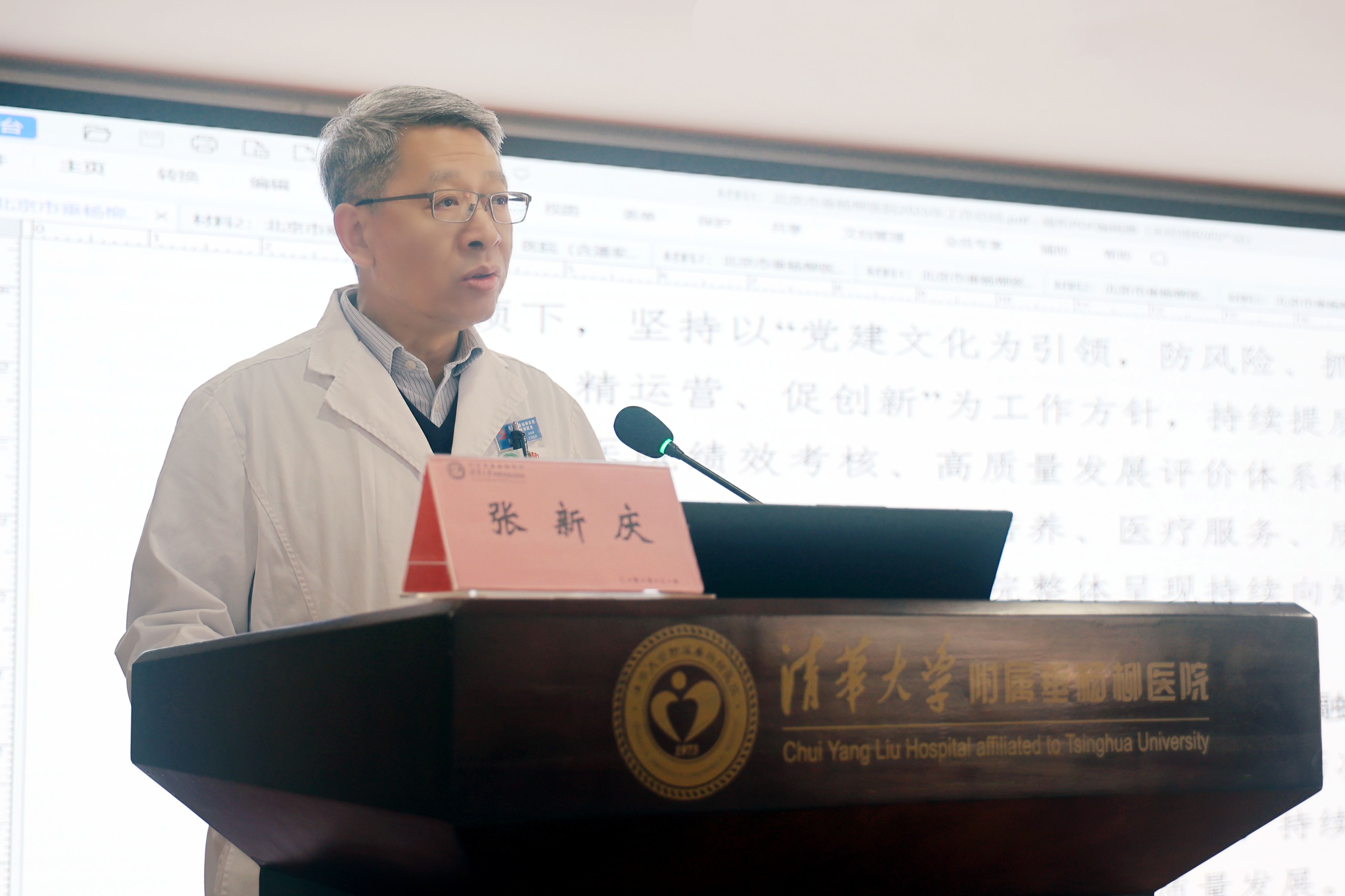 本次大会是在“十四五”圆满收官、“十五五”扬帆起航的关键节点召开的一次重要会议。大会在庄严的国歌声中拉开序幕,院长张新庆汇报医院2025年工作总结与2026年工作计划,报告中全面回顾了过去一年医院在区委区政府、区卫健委及院党委的坚强领导下,坚持以党建引领高质量发展,在学科建设、人才培养、医疗服务、运营管理、智慧医院建设以及清华大学附属医院融合发展等方面取得的成就,他提到面对复杂形势,医院在医疗服务量、技术难度(CMI值)、四级手术占比等关键指标上实现稳步提升,运营结构持续优化,交出了一份令人满意的成绩单。