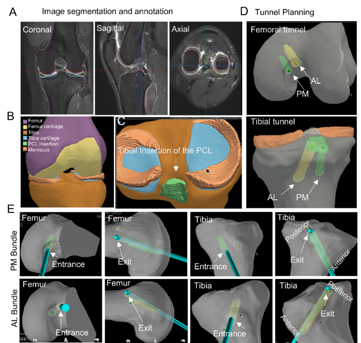 基于此高精度平台,团队成功在精准导航下分别用机器人钻取股骨的ALB和PMB的两个独立骨隧道,以及胫骨的ALB和PMB的两个独立骨隧道,在上述骨道的机器人钻取中,精准导航和力反馈保障的赋能,规避了腘动脉、腘静脉、胫神经等后交叉韧带(PCL)毗邻的关键神经血管结构,提升了手术的精准度与解剖还原度(图2),还缩短了手术时间,为患者重返运动奠定了基础。