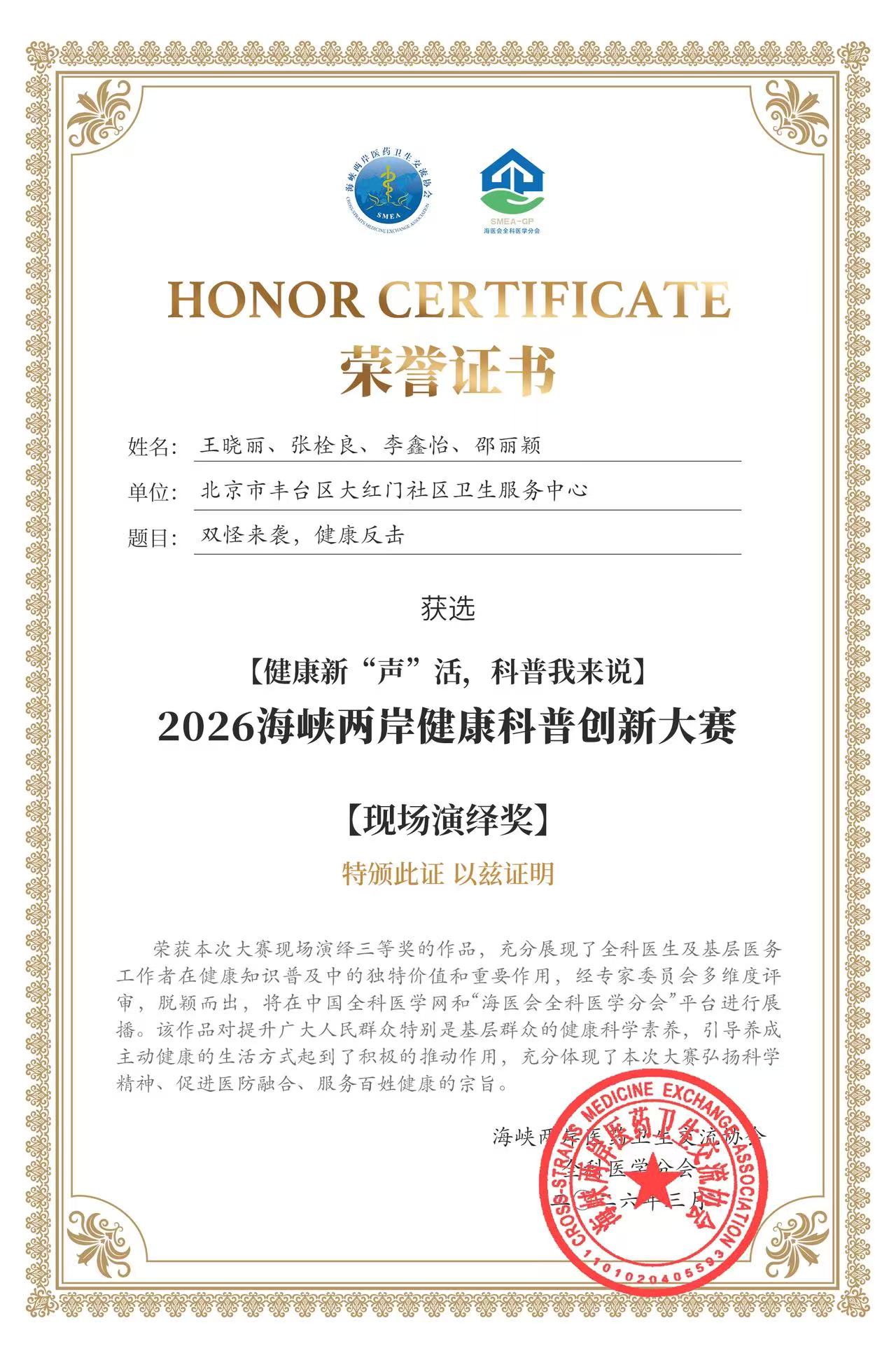 近日,“第十三届海峡两岸全科医学大会”在长沙圆满落幕。在这场全科医学领域的盛会上,来自大红门社区卫生服务中心的全科医生们,不仅展现了基层医务工作者的智慧与活力,更收获了一份沉甸甸的荣誉。