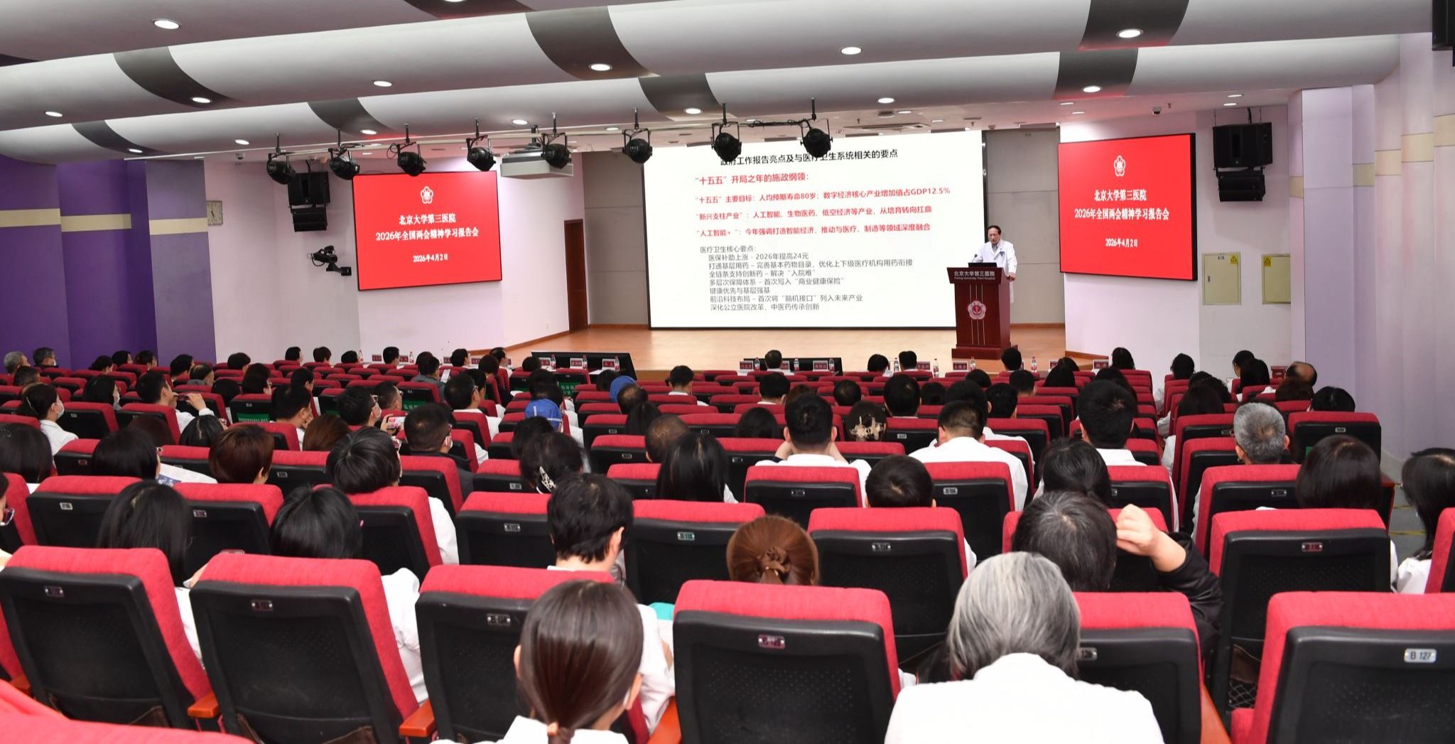 2026年4月2日下午,北京大学第三医院在科学报告厅举行全国两会精神报告会。全国人大代表、北京大学第三医院脊柱外科研究所所长、骨科专家刘忠军教授,全国政协委员、北京大学医学部主任、北京大学第三医院医学创新研究院院长、生殖医学专家乔杰院士传达了习近平总书记在全国两会期间发表的重要讲话精神,传达十四届全国人大四次会议、全国政协十四届四次会议精神,并交流履职情况和参会心得。医院领导、中层干部等参会。会议由北京大学第三医院党委副书记、纪委书记陈红松主持。