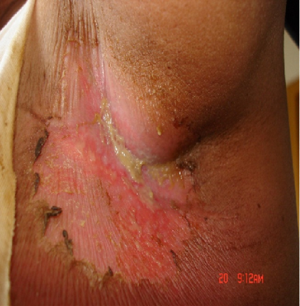 放射性皮炎:放射性皮炎是电离辐射引起的皮肤黏膜炎症,发生率达90%,多见于乳腺、头颈部、肛门、外阴癌放疗后。表现为脱皮、脱屑、瘙痒、色素沉着,严重时破溃、坏死、疼痛。急性者出现于放疗后几天至数月,慢性者在数月至数年后发生。