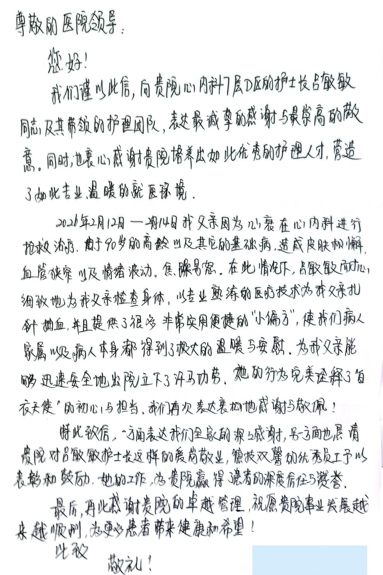 桃李不言,下自成蹊。心脏中心医护团队的精准救治和暖心关怀,让患者和家属看在眼里。在患者病情好转,平安出院之际,他们向医护团队送来了一封饱含感激的表扬信。信中,患者和家属用朴实的话语,表达了对医院、科室的感激之情。