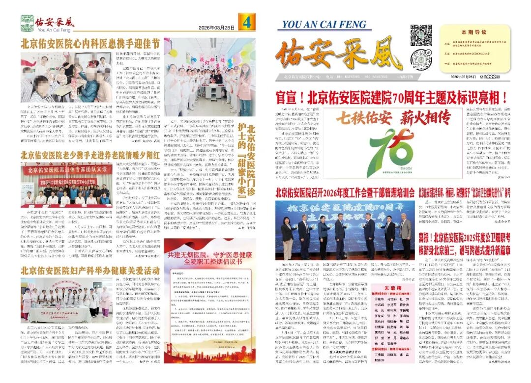 翻开2026年第333期《佑安采风》,全景画卷徐徐展开。既有党建引领的坚实足迹、学科腾飞的昂扬之势,又有服务患者的精准举措、暖心成效;尤其今年是北京佑安医院建院70周年,在近期举办的2026年度工作会及干部管理培训上正式发布北京佑安医院建院70周年主题及标识 。本期采风字里行间,处处彰显着佑安人昂扬向上的精神风貌。
