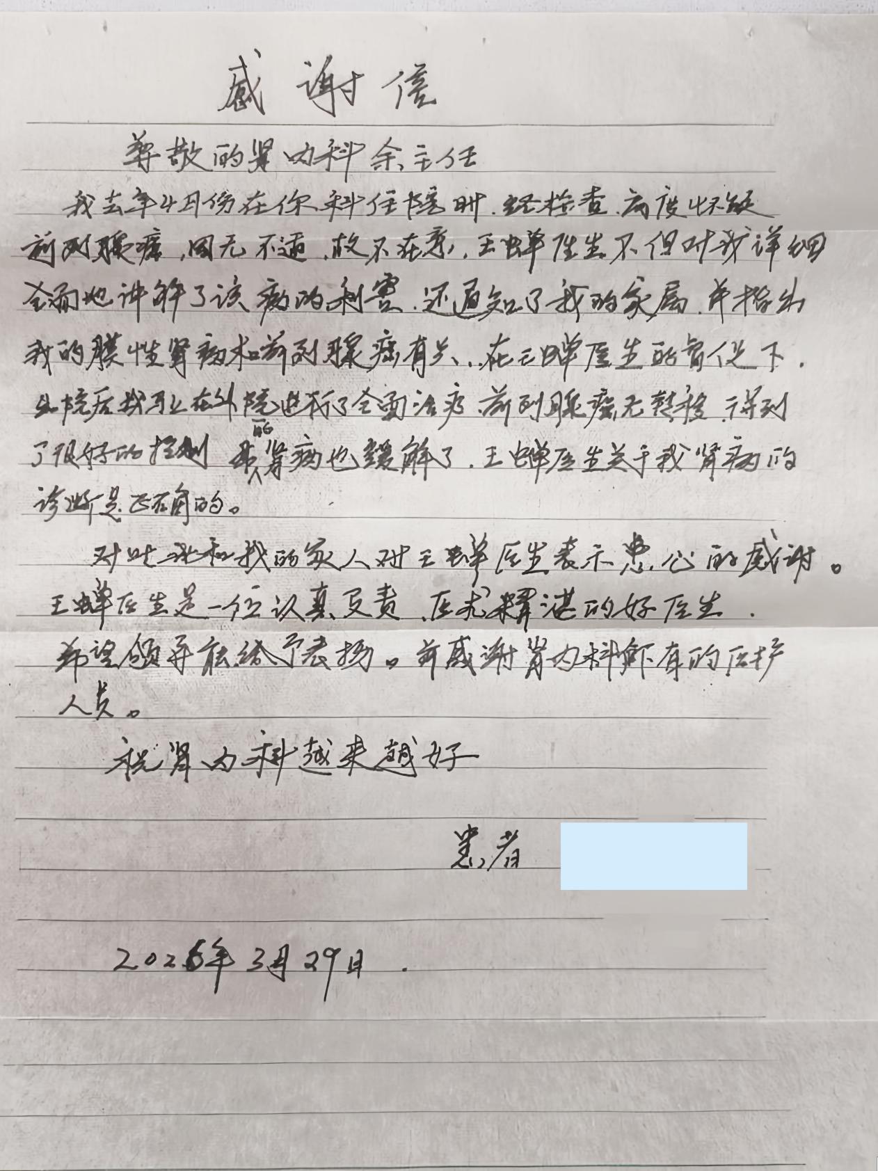 事后,茹先生在信中写道:王蝉医生是一位认真负责、医术精湛的好医生。同时,他也向医院肾内科全体医护人员表达了诚挚的谢意。