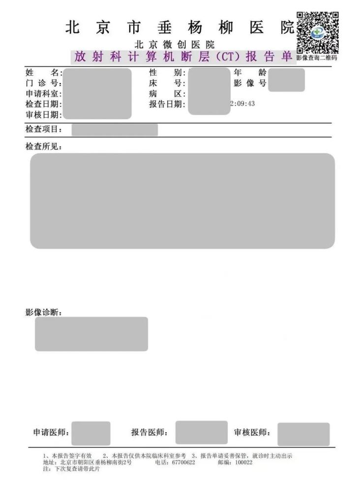 为保障电子影像随时可查、随需可看,目前,放射科出具的检查报告单上均已增印“影像查询二维码”,患者使用手机扫描后即可直接跳转至“京通”小程序,快速查阅本人数字影像及检查报告。