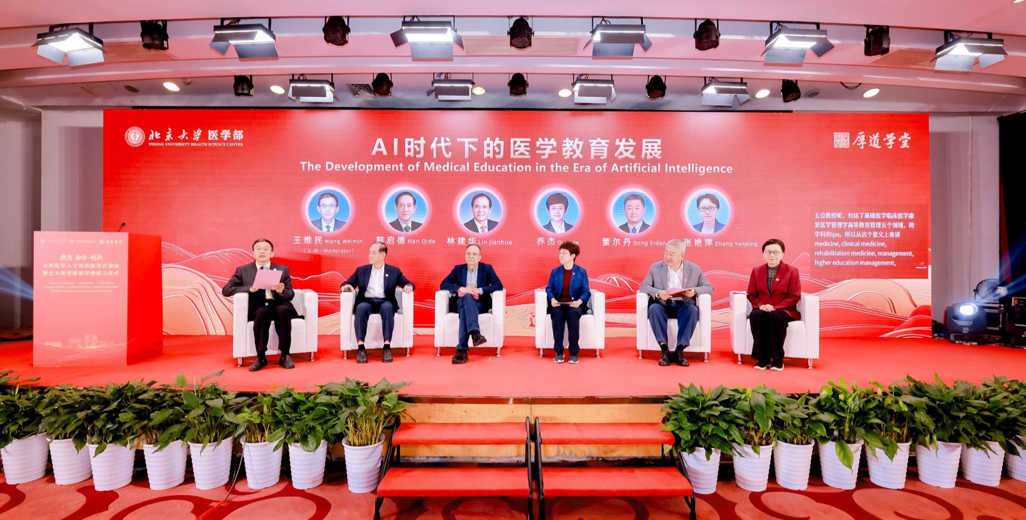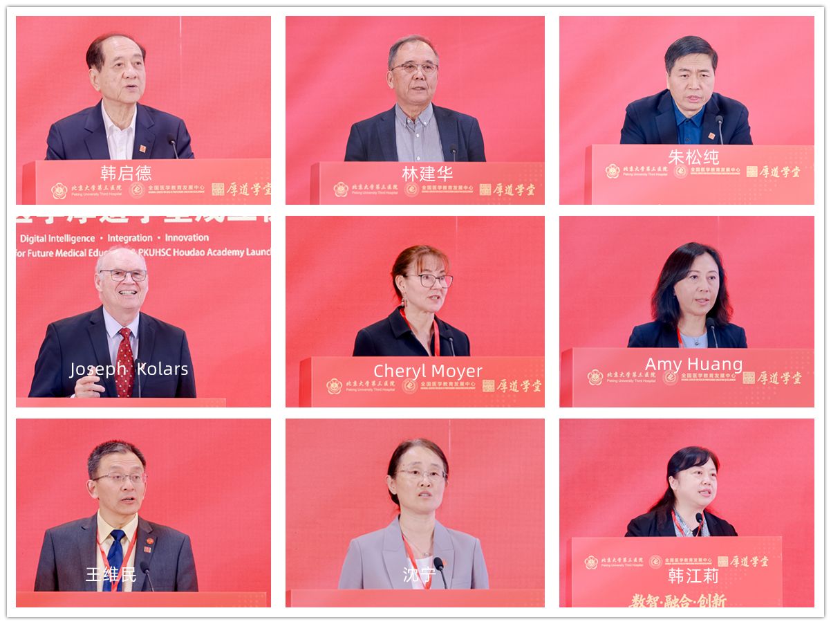 中国科学技术协会名誉主席韩启德院士,中国高等教育学会会长、教育部医学教育专家委员会主任委员林蕙青,教育部高等教育司副司长高斌,国家卫生健康委科技教育司医学教育处处长王波,教育部高等教育司农林医药处处长夏韶华,北京大学原校长、未来教育管理研究中心主任林建华,北京大学医学部主任乔杰院士,北京大学心血管研究所所长、康复大学校长董尔丹院士,全球知名人工智能专家、北京通用人工智能研究院院长朱松纯,密歇根大学医学院全球合作战略发展主任Joseph C. Kolars,密歇根大学学习健康科学系副主任Cheryl Moyer,密歇根大学全球健康拓展与合作中心亚洲项目主任Amy Huang,国家开放大学党委书记、校长王启明,上海交通大学党委副书记、医学院党委书记张艳萍,山西医科大学党委书记刘江平,北京航空航天大学副校长吴江浩,哈尔滨医科大学副校长许超千,全国医学教育发展中心常务副主任、北京大学医学教育研究所所长王维民,北京大学医学部副主任、北京大学第三医院副院长唐熠达,北京大学第三医院院长付卫、党委副书记姜雪、副院长沈宁等领导和嘉宾出席。