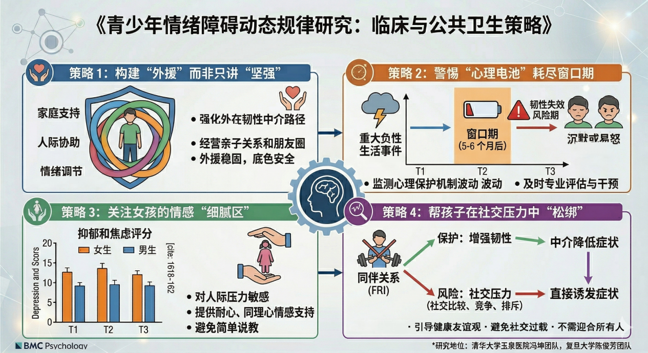 通讯作者冯坤主任医师指出:“本研究的核心价值在于其时间敏感性。我们不仅关注谁更容易出现问题,更聚焦于在什么时间、通过什么机制问题得以形成或被缓解。这种动态视角为学校和家庭制定科学的预警与干预方案提供了直接依据。”