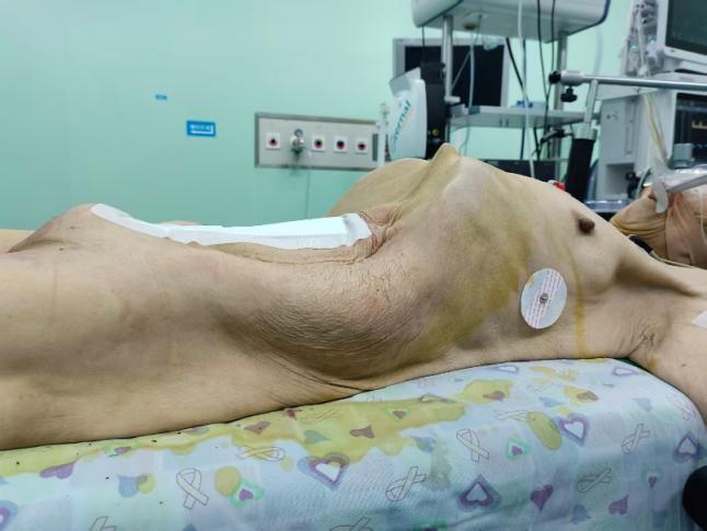 近日,我院妇科病房收治了一位78岁的老年女性患者。患者腹部极度膨隆,程度远超双胎妊娠女性;更令人揪心的是,她早在6年前就已查出腹盆腔巨大占位,但因年事已高且合并老年痴呆、腔隙性脑梗死等多种基础疾病,家属当时坚决拒绝手术。此次患者并非因妇科症状就诊,而是因消化道出血急诊入院,影像学检查进一步显示,其盆腔肿物最大径线已达50cm,且合并下肢静脉血栓,病情复杂危重。