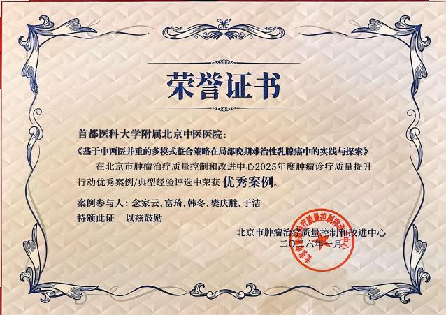 近日,北京中医医院肿瘤科报送的《基于中西医并重的多模式整合策略在局部晚期难治性乳腺癌中的实践与探索》案例,在北京市肿瘤治疗质量控制和改进中心2025年度肿瘤诊疗质量提升行动优秀案例评选中荣获优秀案例,这套兼顾疗效与患者生存质量的整合诊疗模式,得到了行业的官方认可。