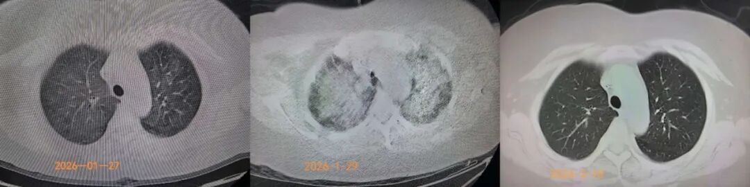 在秦女士持续高热、病情进展的危急时刻,医疗团队果断升级抗感染方案,及时加用糖皮质激素抗炎,快速遏制炎症风暴。通过这一系列及时、精准的救治,患者发热快速消退,血氧趋于稳定,肺部炎症逐步吸收,成功闯过了化疗后并发症这一难关。