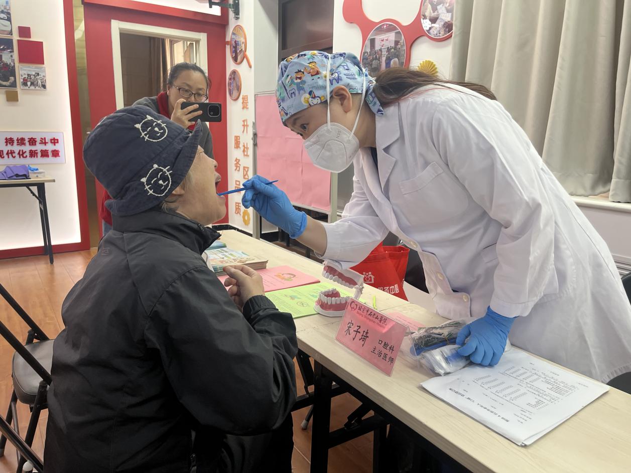 口腔科宋子琦主治医师为老年居民进行简易口腔检查,指出存在的牙周问题及缺牙修复建议,手把手教大家正确刷牙。