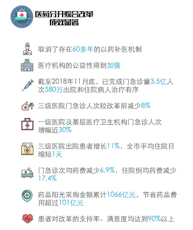 北京从2017年4月实施医药分开综合改革以来,总体平稳、符合预期、反响良好。截至2018年11月底,已完成门急诊量3.5亿人次,580万出院和住院病人治疗有序,取消了存在60多年的以药补医机制,医疗机构的公益性得到加强。