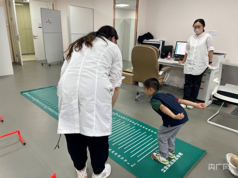 首都儿科研究所附属儿童医院康复诊室,医护人员指导患儿测试立定跳远