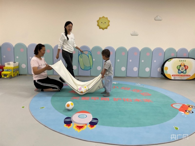 在首都儿科研究所附属儿童医院的康复诊室,医护人员带领患儿通过游戏动作,测试运动能力恢复效果。同一层楼的婴幼儿养育照护指导中心,工作人员陪同患儿、家长一起游戏。