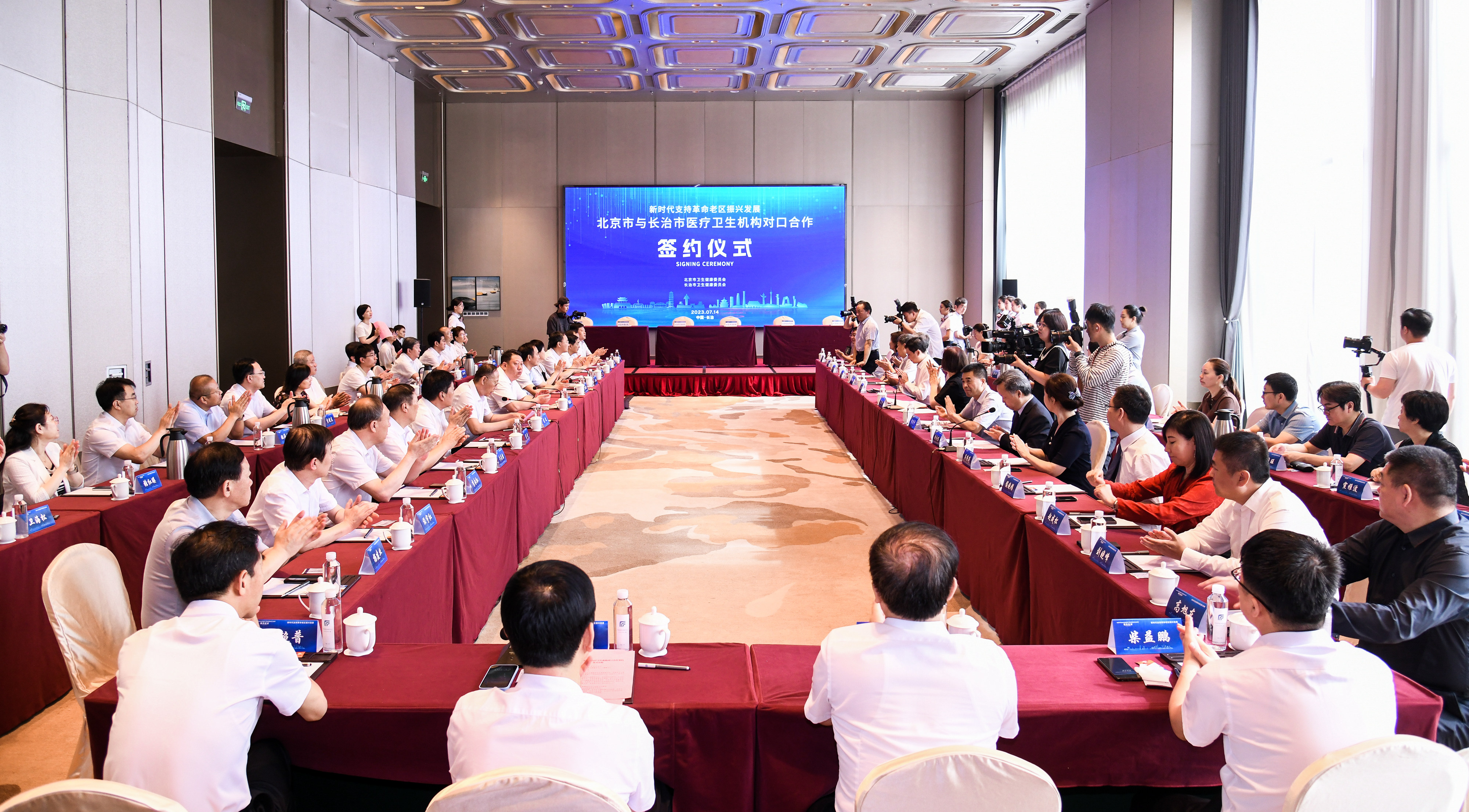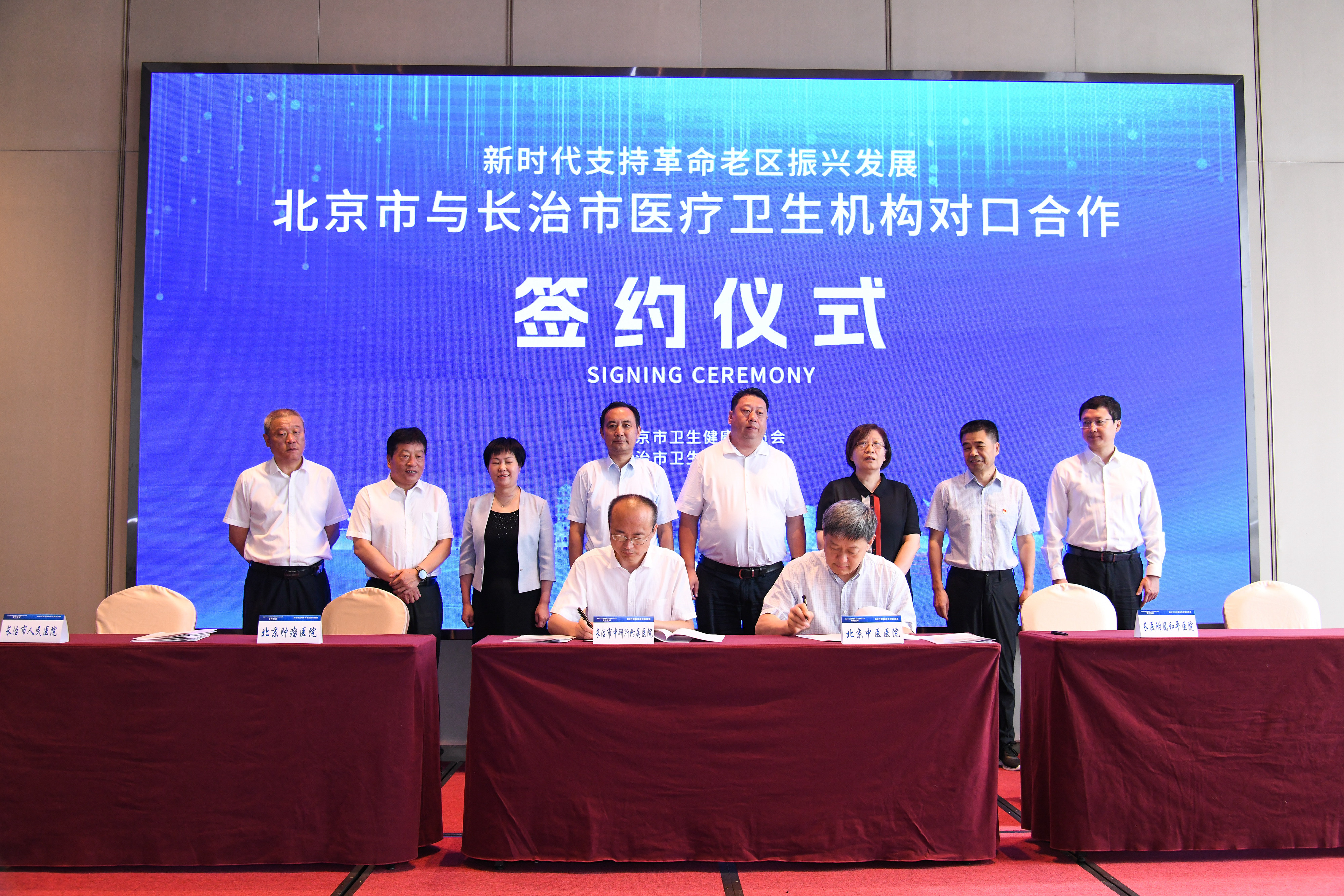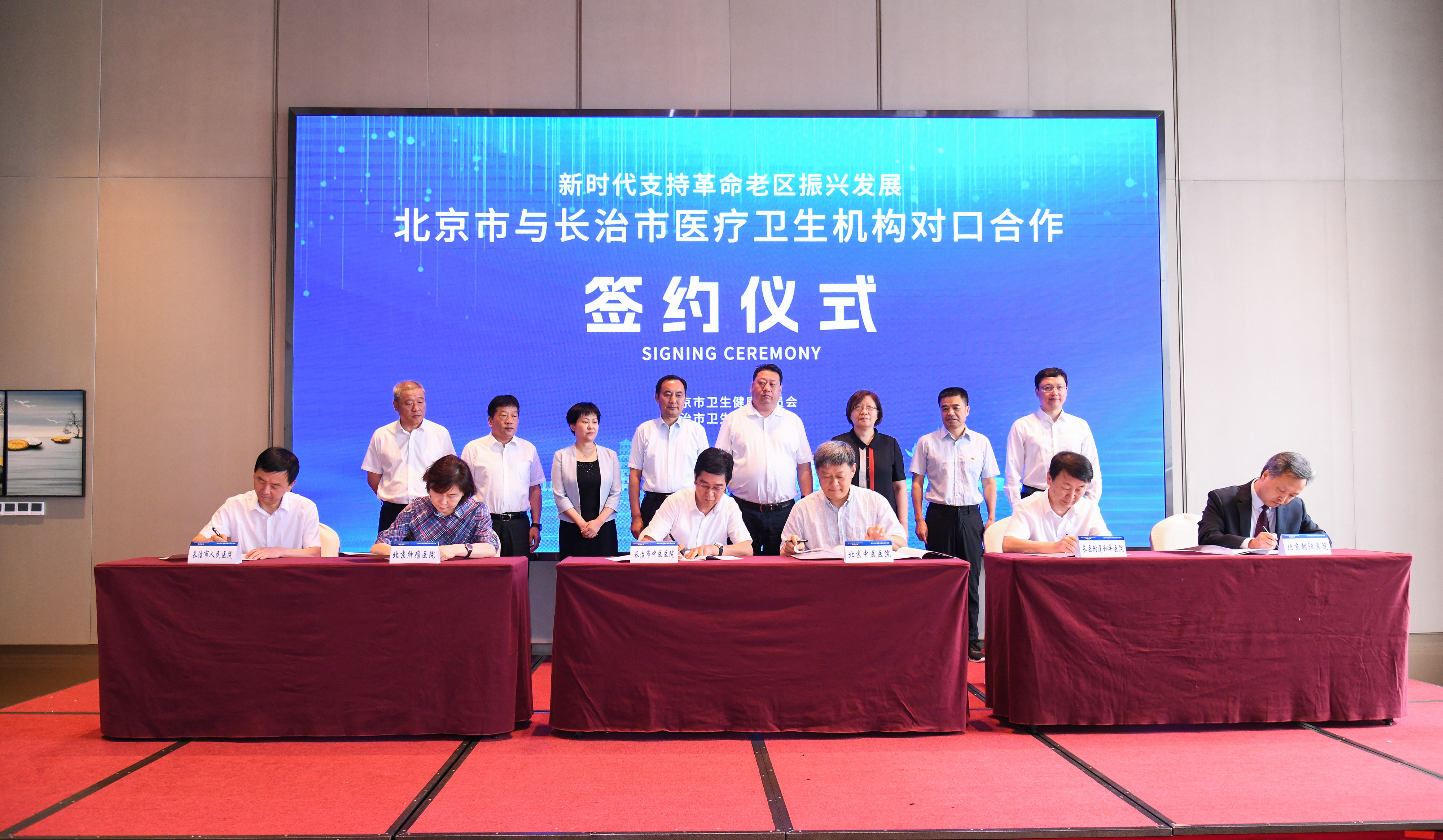 7月14日上午,北京市卫生健康委与长治市卫生健康委在长治举行“新时代支持革命老区振兴发展 北京市与长治市医疗卫生机构对口合作”签约仪式,北京朝阳医院等9家市属医院及市疾控中心等2家公共卫生单位,与长治市人民医院、长治市疾控中心等11家医疗卫生机构签订合作协议,正式开启了京长医疗卫生对口合作。北京市卫生健康委党委委员、副主任高坚,山西省卫生健康委二级巡视员刘保升,长治市人民政府副市长邢张朋,长治市卫生健康委党委书记、主任王旭琴,长治市对口合作办、发展改革委主任王灵恩等领导出席。长治市政府督查专员黄孜主持签约仪式。