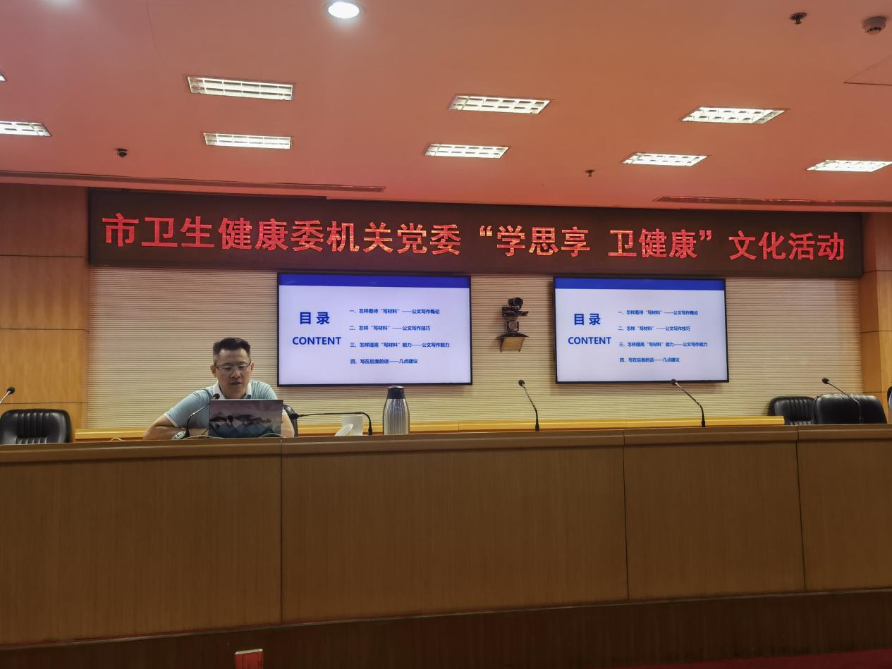 为扎实推进模范机关创建,搭建干部职工思想交流平台,营造干事创业的良好文化氛围,9月15日,市卫生健康委机关党委举办第七期“学思享 卫健康”文化活动,邀请中国人民大学高校思想政治工作创新发展中心杜鹏研究员以“写材料的那些事儿”为主题,开展机关公文写作讲座,机关各处室和直属单位百余人参加活动。