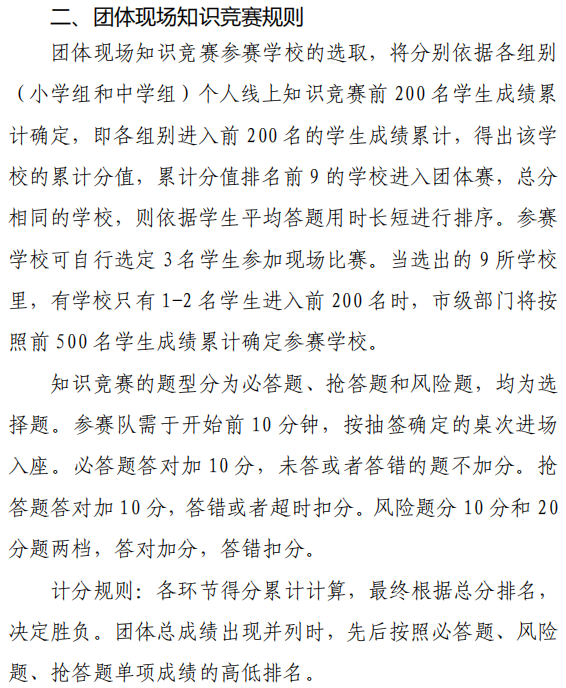 团体现场知识竞赛以学校为单位参赛,以现场比赛形式进行。团体竞赛分小学组和中学组两组,参赛学校选取规则详见附件2。参赛学校名单6月下旬以通知形式公布,现场竞赛具体安排另行通知。