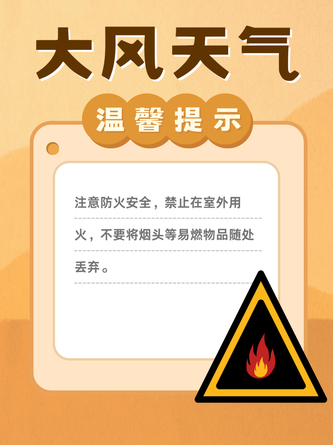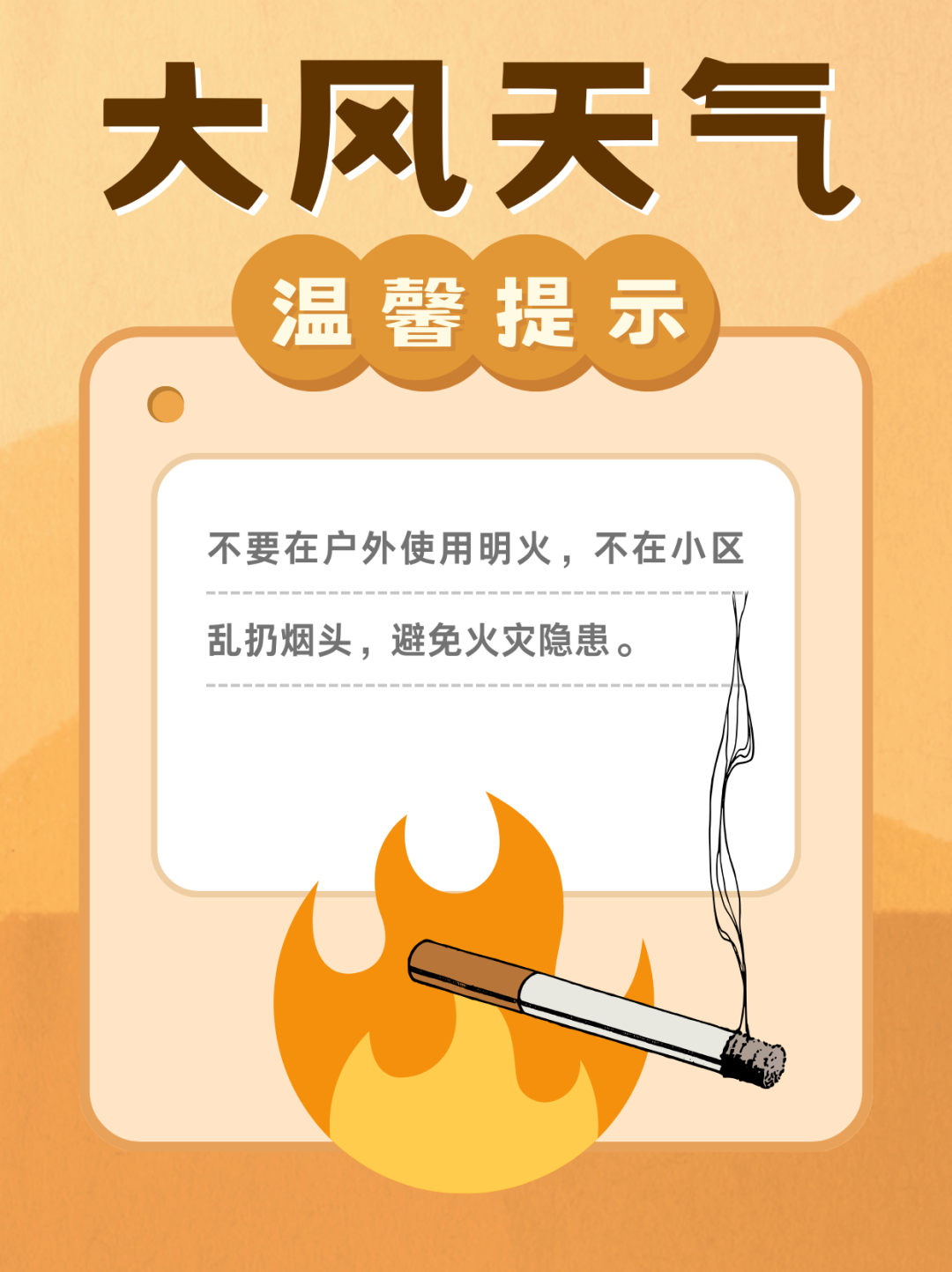 狂风起时火患升,不在室外用明火,守护安全家园 。