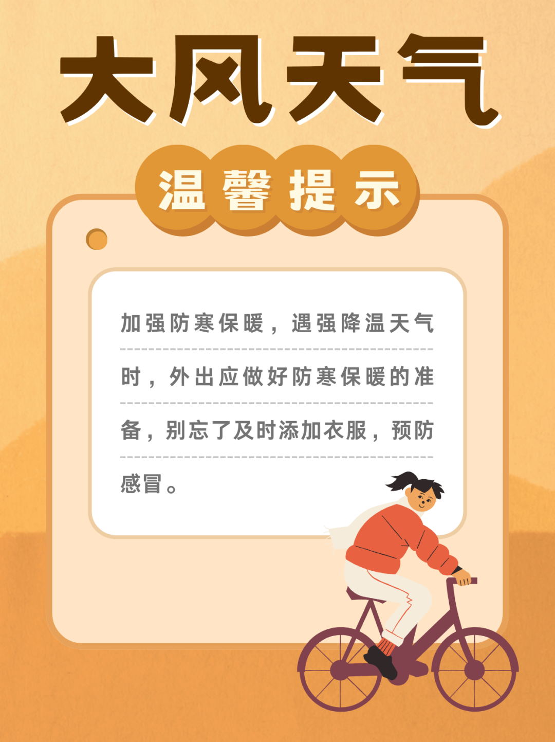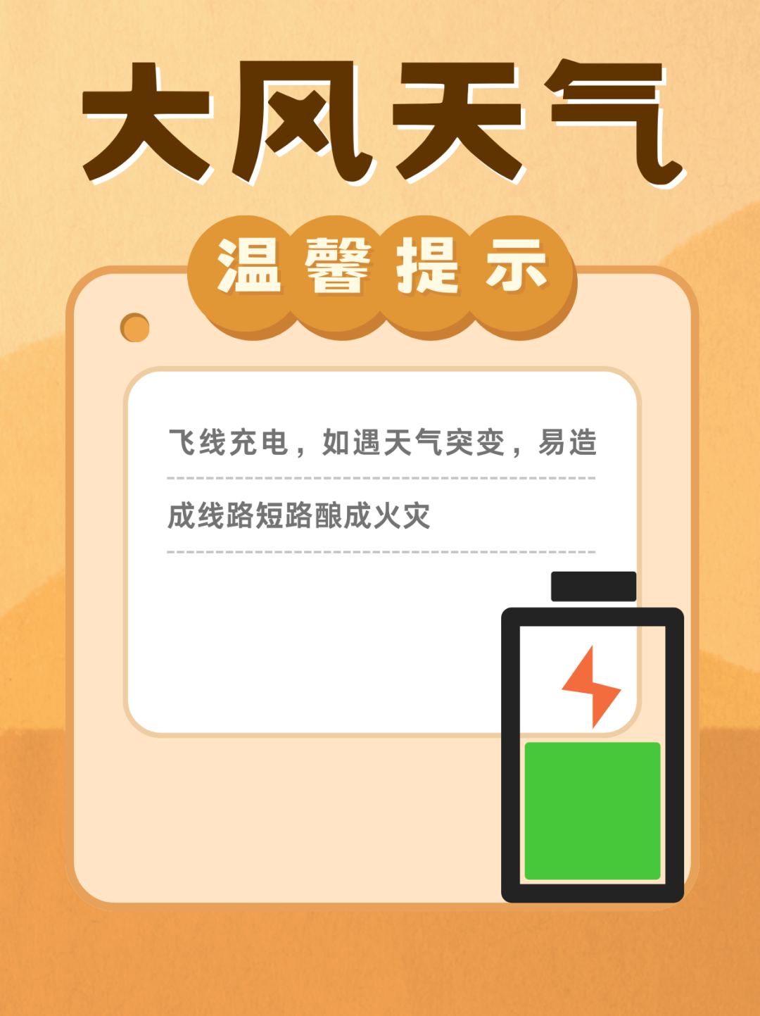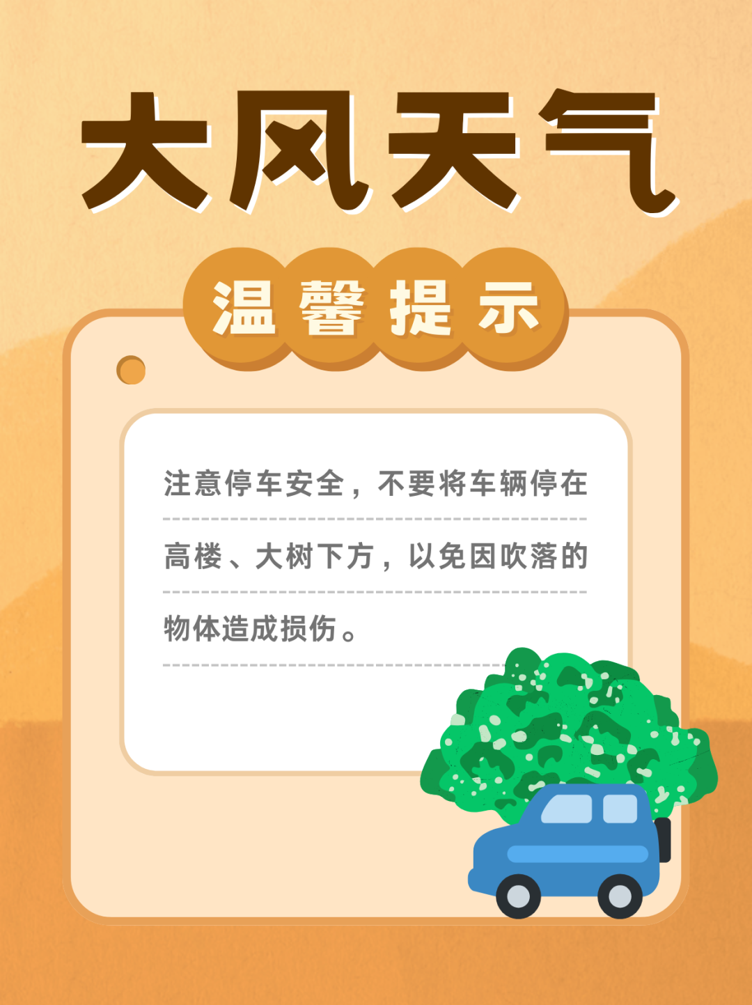 春季大风天气多发,出行需注意安全,车辆、人员应避免在高大建筑物、广告牌、临时搭建物或大树的下方停留;驾车出行注意防范横风、侧风。同时,空气持续干燥,森林火险等级较高,请勿野外用火,谨防火灾。