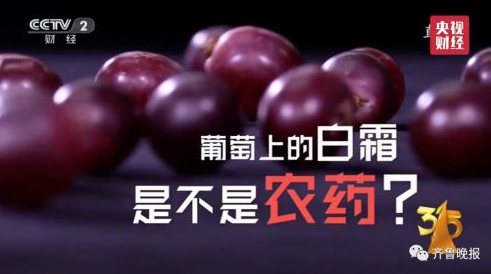 很多人认为,葡萄上的白霜是喷洒的农药残留,吃了会中毒。“3·15”晚会现场,专业的实验室,专业的仪器,专业的检测手段,得出专业的实验结果:葡萄上的白霜不是农药。这种白霜的主要成分其实是无毒无害的天然蜡质,还有少量的糖类等有机质。而真正的农药残留是微量物质,很少能肉眼看见。除了葡萄之外,冬瓜、李子和蓝莓等很多果蔬的表面的白霜,也是同样的物质。